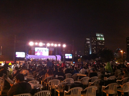 I had the pleasure of attending a performance of the tour in San Diego on July 12. I arrived at the Embarcadero Marina Park, literally right behind the San Diego Convention Center, during Comic-Con, no less! Being there felt like something out of a dream, as I was surrounded by so many passionate fans dressed up as their favorite Zelda characters. Links, Zeldas, Sheiks, even the Postman from Twilight Princess (who later won a costume contest on stage!) teamed about, recollecting their favorite Zelda memories, and some even played their favorite melodies on their very own ocarinas. It definitely felt as if we had stepped into the land of Hyrule itself. The location almost seemed too perfect for the night’s festivities, as the park was a little green plain inlet peninsula overlooking the ocean, reflecting many of the locations from the series. GameStop had also set up several Wii consoles, and even hosted a small shooting contest from the rather obscure Link’s Crossbow Training game. Aside from these, there was a small merchandising booth selling Symphony of the Goddesses T-shirts and posters.